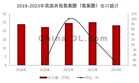 2019-2013年我國氫氟酸出口則呈現(xiàn)波動變化態(tài)勢,維持在22~25萬噸水平,2023年達到23.4萬噸,同比下降7.1%。