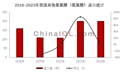 我國是無水氫氟酸凈出口國,進口稀少,氟資源更多以螢石粉形式流入國內(nèi)。海關(guān)數(shù)據(jù)顯示,自2019年起,我國無水氫氟酸進口量呈現(xiàn)先減后增態(tài)勢,2023年達到202噸,基本與2022年進口量持平,較2021年相比增長了86.2%。