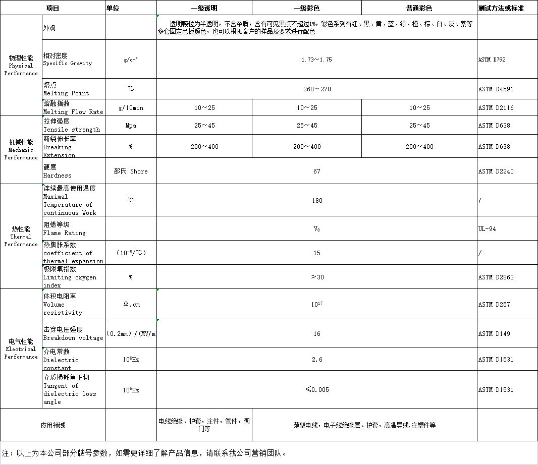 ETFE是一種結(jié)晶性高聚物,熔點(diǎn)265~270℃;密度1.73~1.75g/cm3;長(zhǎng)期使用溫度可以在-60~+170℃具有良好的耐化學(xué)性、耐熱性、耐磨性、耐輻照及耐沖擊和點(diǎn)絕緣性能,尤其是力學(xué)性能強(qiáng)度和伸長(zhǎng)率都好于PFA和FEP