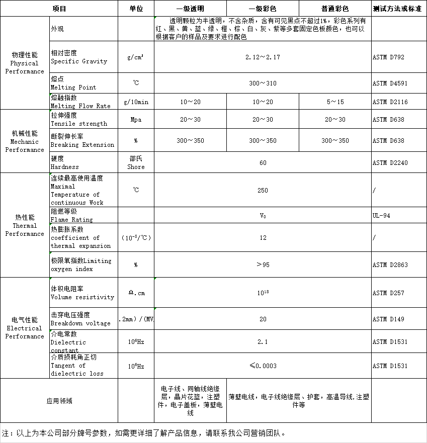 適應(yīng)于電子電氣工業(yè)導(dǎo)線絕緣層,高頻及超高頻絕緣,電子設(shè)備絕緣零件,電線電纜絕緣和護(hù)套,連接器插座,支座絕緣,印刷電路板,靜電擴(kuò)音機(jī)用膜等。特別是小規(guī)格的薄壁絕緣線,其加工速度較一般聚四氟乙烯饒包線生產(chǎn)效率高幾十倍。
