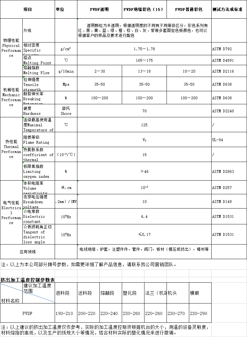 PVDF相對密度為1.75~1.78,玻璃化溫度為-39℃,脆化溫度為-62℃以下,熔點(diǎn)為144℃,熱分解溫度在320℃以上。長期使用溫度為-40~+125℃,從熔點(diǎn)到分解溫度的加工溫度范圍寬,加工溫度低,熔融粘度小,容易加工。機(jī)械強(qiáng)度是氟樹脂中最優(yōu)越的產(chǎn)品,且在一定溫度和受壓下仍能保持良好的強(qiáng)度。拉伸強(qiáng)度高。沖擊強(qiáng)度好,韌性好;硬度大,耐磨性好;抗蠕變性也是氟樹脂中最優(yōu)之一;具有突出的抗紫外線和耐氣候者化的特性,其薄膜在室外放置一、二十年也不變脆龜裂。耐輻照性能也較突出,其薄膜經(jīng)受3×108拉特r-射線輻照后,性能未見嚴(yán)重下降。電絕緣性能優(yōu)異。