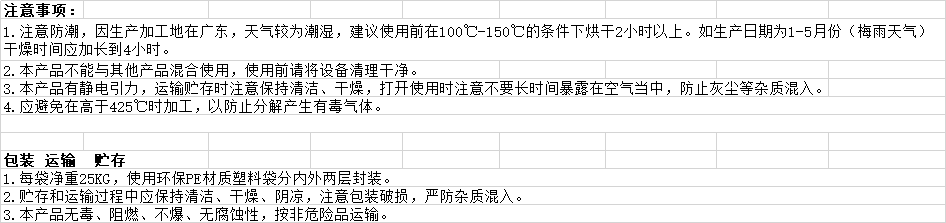 4.應(yīng)避免在高于425℃時加工,以防止分解產(chǎn)生有毒氣體。