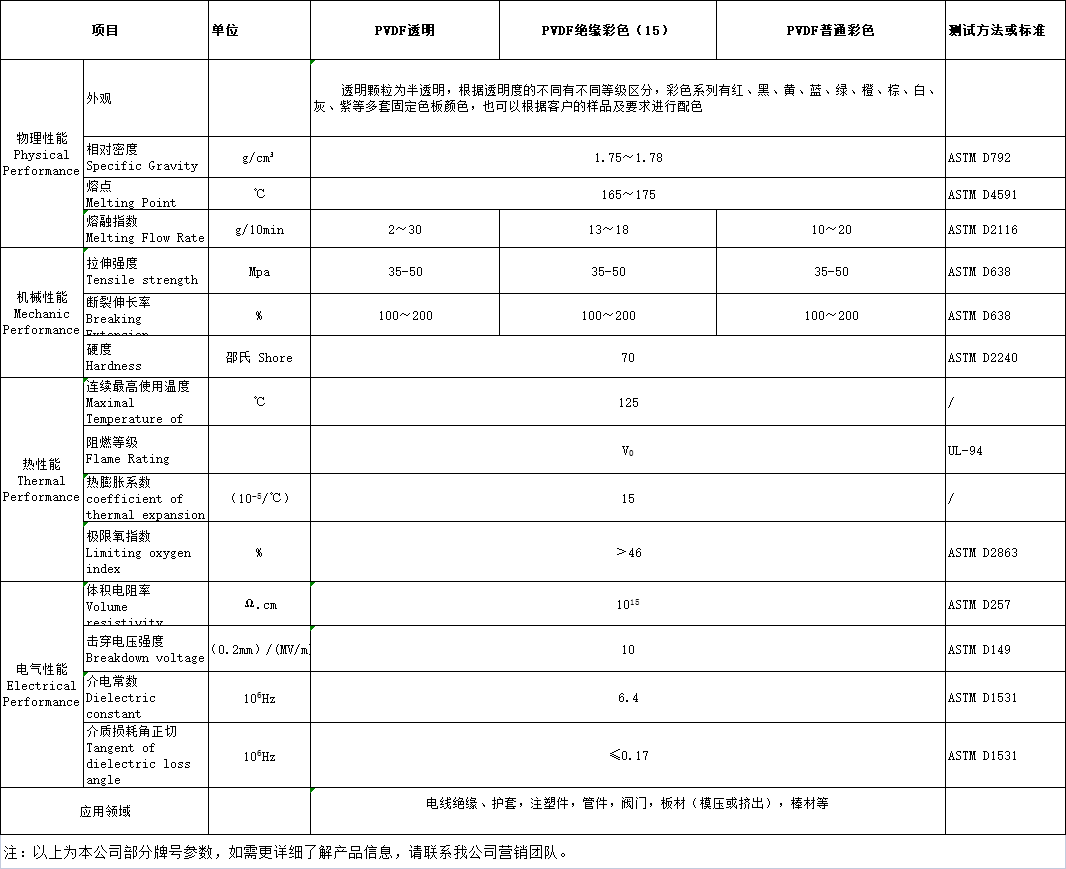 PVDF相對(duì)密度為1.75~1.78,玻璃化溫度為-39℃,脆化溫度為-62℃以下,熔點(diǎn)為144℃,熱分解溫度在320℃以上。長(zhǎng)期使用溫度為-40~+125℃,從熔點(diǎn)到分解溫度的加工溫度范圍寬,加工溫度低,熔融粘度小,容易加工。機(jī)械強(qiáng)度是氟樹(shù)脂中最優(yōu)越的產(chǎn)品,且在一定溫度和受壓下仍能保持良好的強(qiáng)度。拉伸強(qiáng)度高。沖擊強(qiáng)度好,韌性好;硬度大,耐磨性好;抗蠕變性也是氟樹(shù)脂中最優(yōu)之一;具有突出的抗紫外線和耐氣候者化的特性,其薄膜在室外放置一、二十年也不變脆龜裂。耐輻照性能也較突出,其薄膜經(jīng)受3×108拉特r-射線輻照后,性能未見(jiàn)嚴(yán)重下降。電絕緣性能優(yōu)異。